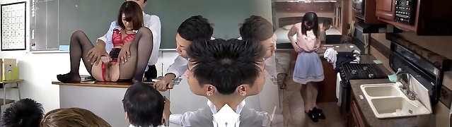 Night school teacher seduces 3 students at the same time and gets a pile of cum
