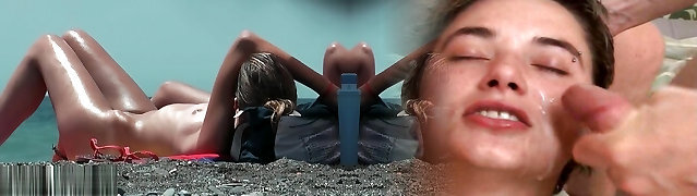 Stuffing her tight wet pink pussy on the warm beach