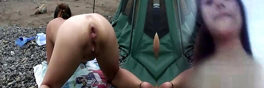 Fisting the wifes demolished holes at the beach