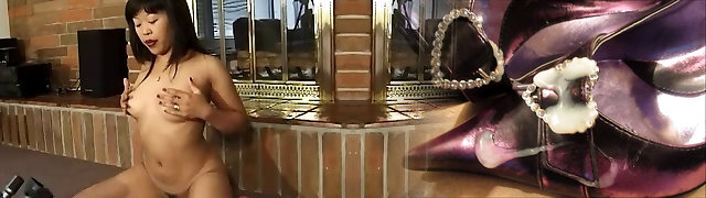In front of the fireplace this Asian girl disrobes and plays