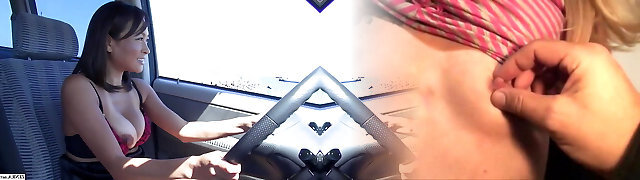 Tan and naturally big-chested Japanese MILF has wild car sex while driving