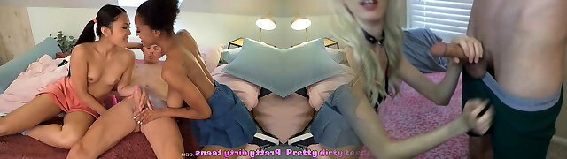 DEVIANTE - Big Tits Dark-hued and Asian Thai college roomies play video games and discover friends male masturbating fucktoy