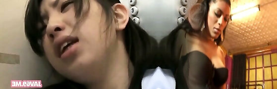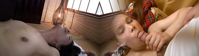 Japanese hairy cootchie Lina Aishima threesome sex uncensored.