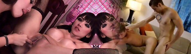 Japanese bisexual stud and brunette wearing strap-on fuck with bald man on bed