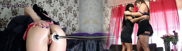 Two horny lesbo Asian babes riding a fuck machine