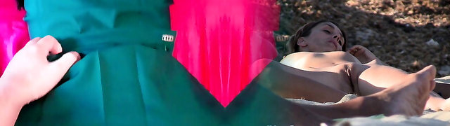 Asian teen poses outdoors before masturbating