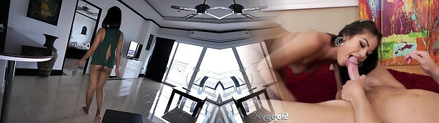 Yummy Diminutive Asian Jade Kimiko Gets Found Hiding in the Kitchen and Takes On Charles Dera's Enormous Cock
