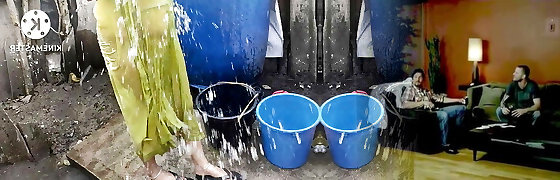 Indian Desi Bhabhi Outside Bathing dressed in see through nighty and showing neighbor