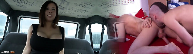 Juggy Asian hoe Tigerr Benson flashes her big titties and gets fucked in the back seat
