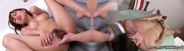 Japanese hairy cootchie Lina Aishima threesome sex uncensored.