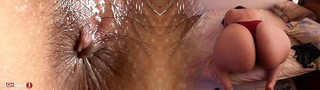 'Teen in bikini oils up her hairy pussy'