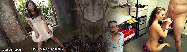 Depraved slender Japanese chick stripteases in deserted mansion and flashes hairy pussy