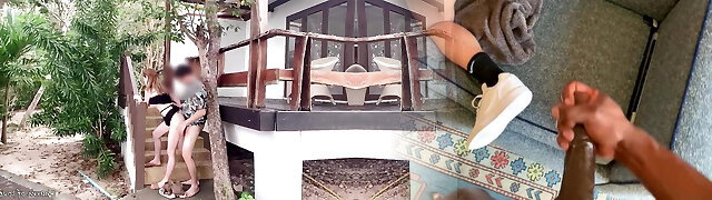 Photographer plumbing Thai model outdoors