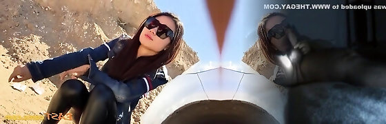 Asian whore pees behind truck
