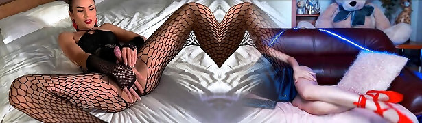 Ladyboy in fishnet bodystocking plays with a pink hitachi