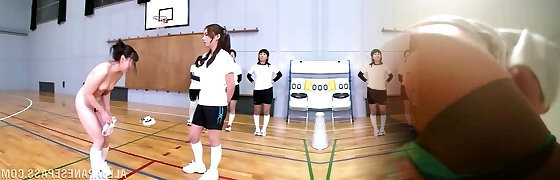 Asian women on the volleyball crew haze a new member with a strapon