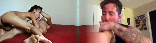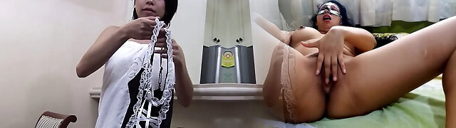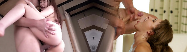 A petite Asian brunette entertains a white stranger and smashes him in crotchless pantyhose.